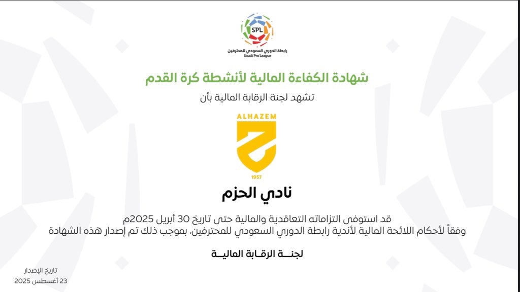 أعلن نادي الحزم عن استيفائه لجميع التزاماته التعاقدية والمالية حتى تأريخ 30 إبريل 2025، وذلك وفقاً للائحة المالية للأندية الصادرة عن رابطة الدوري السعودي للمحترفين.