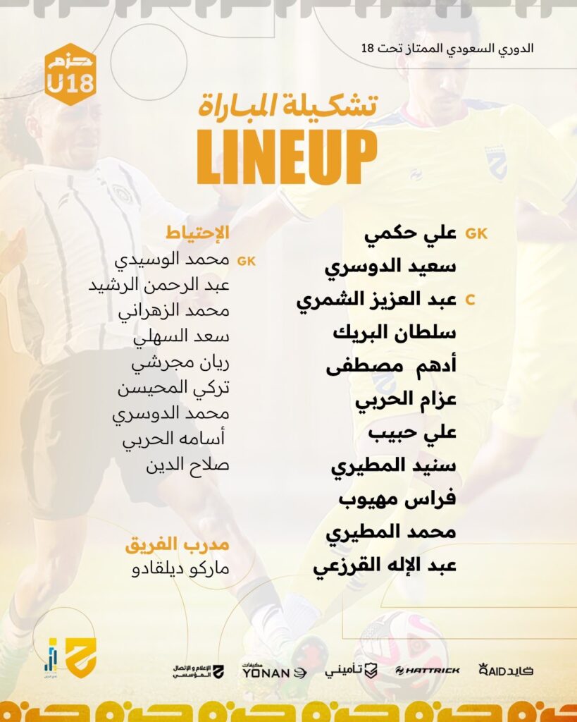 فاز فريق الحزم تحت 18 سنة على أرضه اليوم السبت 4 أكتوبر 2025’على نادي الجيل بنتيجة 2-1 في مباراة قوية ومثيرة. سجل أهداف الحزم سعيد الدوسري وعبدالعزيز الشمري، ليصل رصيد الفريق إلى 4 نقاط من فوز وتعادل وخسارتين، ويحتل المركز 12 في الترتيب.