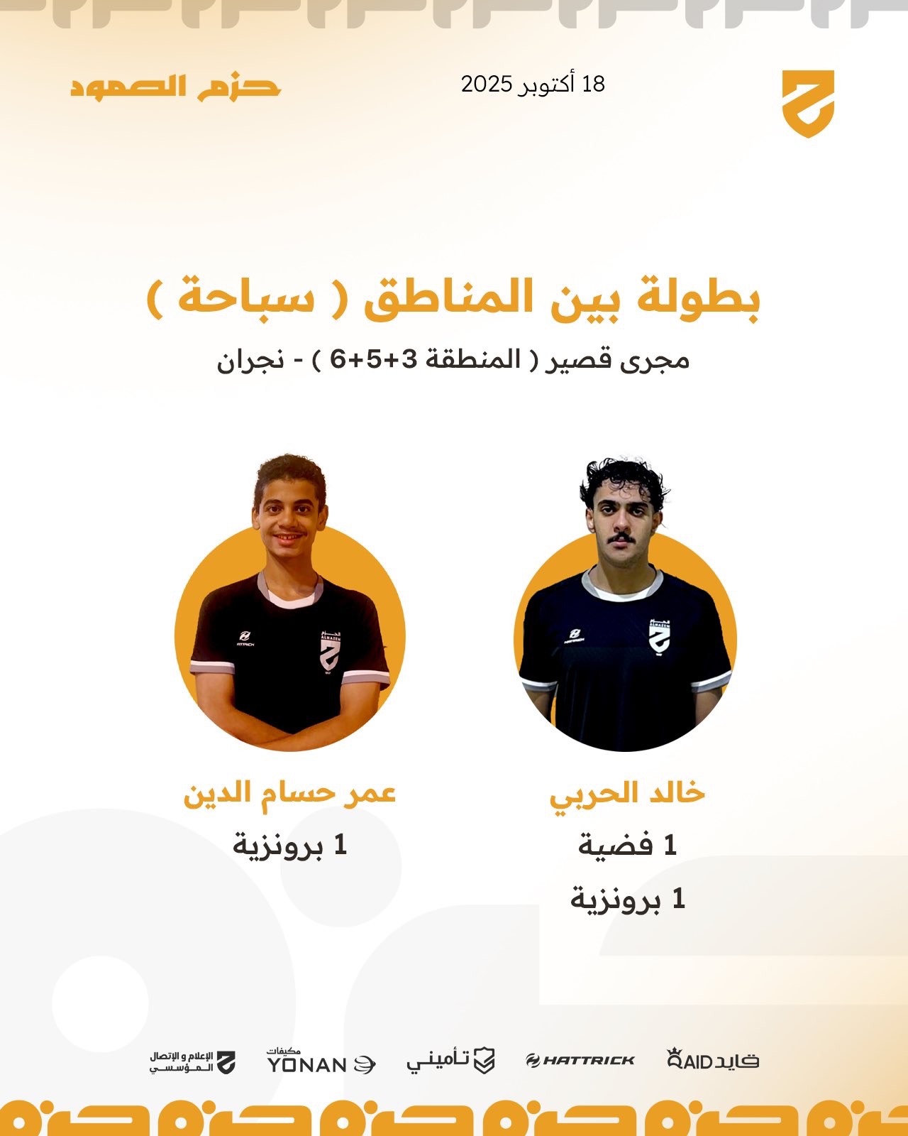 حقق نادي الحزم للسباحة حصد 3 ميداليات في بطولة المناطق للسباحة التي أقيمت في نجران يوم السبت 18 أكتوبر 2025. وجاءت الميداليات على النحو التالي: ميدالية فضية وميدالية برونزية للاعب خالد الحربي، وميدالية برونزية للاعب عمر حسام الدين.