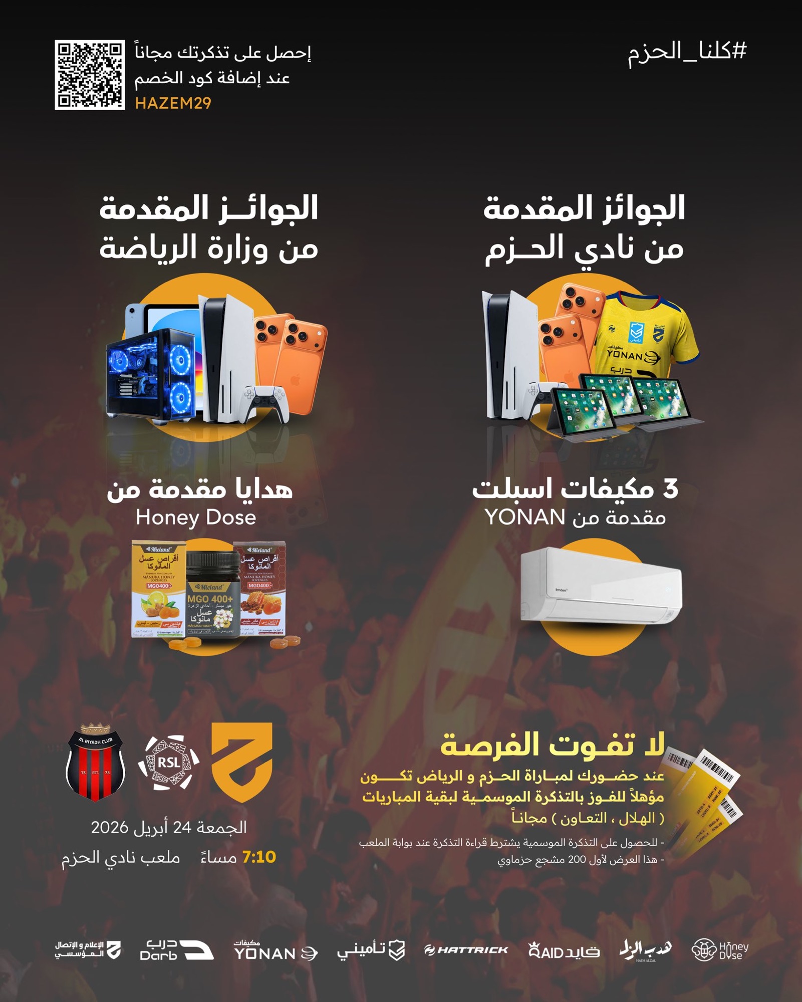 وفي إطار تعزيز الحضور الجماهيري، أعلن نادي الحزم عن عدد من المبادرات التحفيزية، التي تتضمن تقديم جوائز قيّمة للحضور، تشمل أجهزة إلكترونية وهواتف ذكية ومنصات ألعاب، إلى جانب أطقم النادي، إضافة إلى ثلاثة مكيفات سبليت مقدمة من شركة YONAN، وهدايا أخرى مقدمة من شركاء النادي.