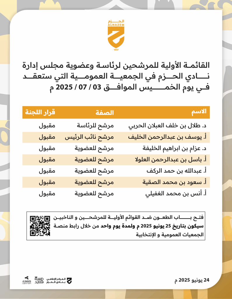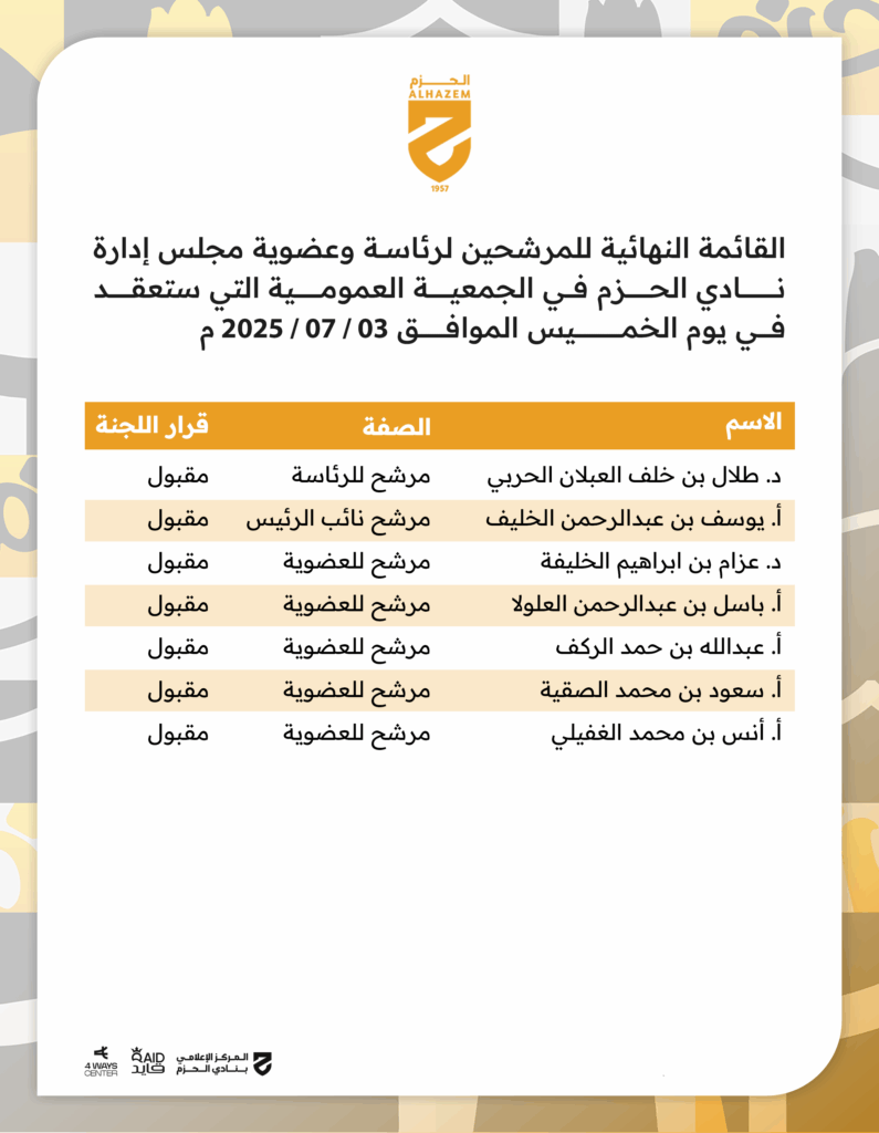 نادي الحزم يتقدم بالتهاني والتبريكات بمناسبة تأهل المنتخب الوطني إلى نهائيات كأس العالم 2026م يتقدم مجلس إدارة نادي الحزم برئاسة الدكتور طلال بن خلف العبلان، بأسمى آيات التهاني والتبريكات إلى مقام خادم الحرمين الشريفين الملك سلمان بن عبد العزيز آل سعود، وإلى سمو ولي العهد رئيس مجلس الوزراء صاحب السمو الملكي الأمير محمد بن سلمان […]
